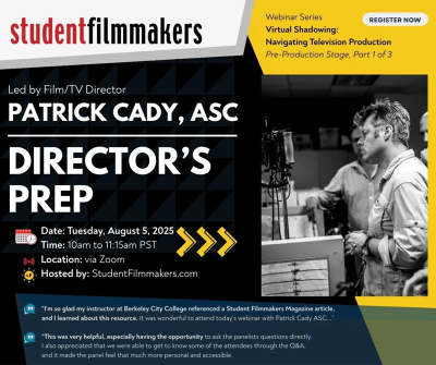 “I’m so glad my instructor at Berkeley City College referenced a Student Filmmakers Magazine article, and I learned about this resource. It was wonderful to attend today’s webinar with Patrick Cady ASC and Tom Bernardo. I look forward to attending more webinars. Thank you!”